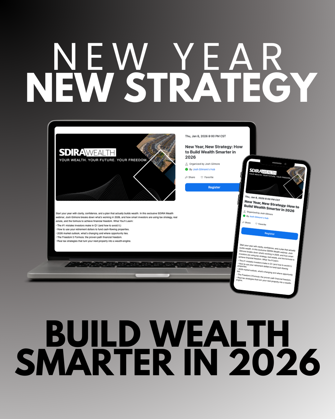 In this exclusive SDIRA Wealth webinar, Josh Gilmore breaks down what’s working in 2026 and how smart investors are using tax strategy, real estate, and a proven framework to build long-term financial freedom.